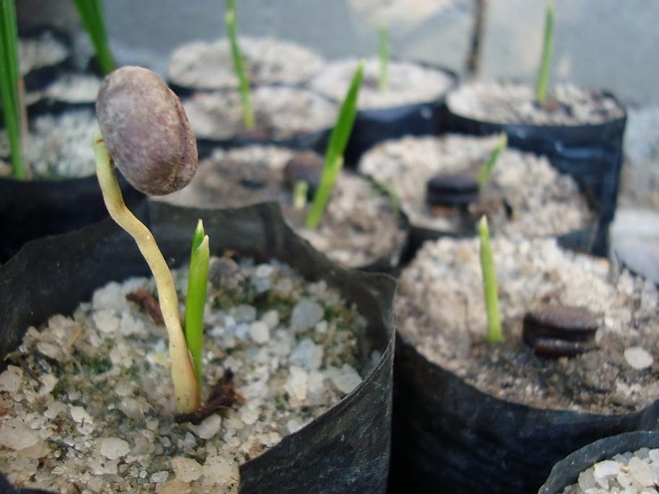 A palánták megjelenésére 2-3 hónappal a vetés befejezése után kell számítani. Azonnal megjegyezzük, hogy a palánták nagyon lassan nőnek. Csak 4-5 évnyi élet után nőnek ki a tenyéren a fiatal, komplex csúcsú levelek.